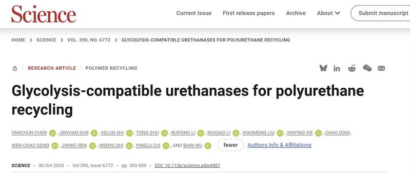 近日,吴边/崔颖璐团队在《科学》(Science)杂志发表题为”Glycolysis-compatible urethanases for polyurethane recycling“的研究论文。研究团队借助人工智能驱动的微生物酶资源挖掘策略,成功发现了一种新型脲酶AbPURase。该酶具有优异的有机溶剂耐受性,在高浓度醇解反应介质中仍能保持极高催化活性与稳定性,与工业聚氨酯醇解工艺高度兼容。这一成果首次实现了在工业条件下聚氨酯的规模化生物解聚,为聚氨酯塑料的绿色循环利用提供了高效、可持续的新路径。