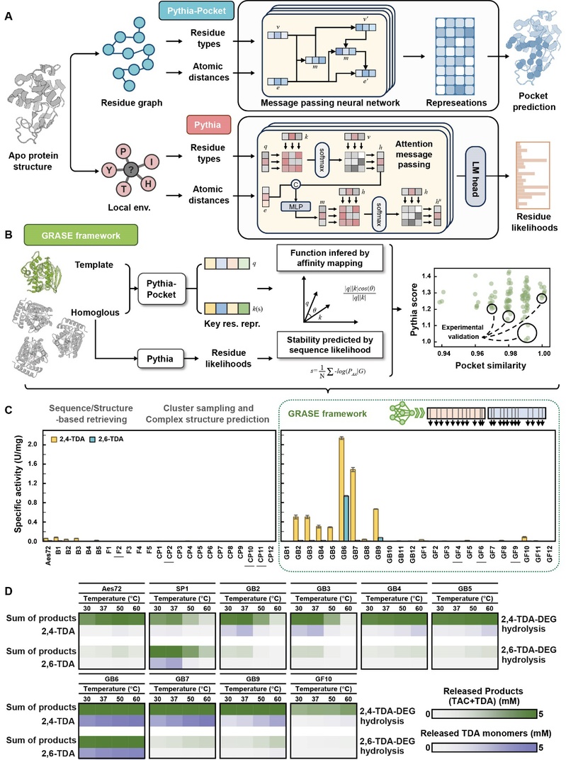 为实现聚氨酯的生物酶解,关键在于开发能够高效水解氨基甲酸酯键的脲酶。然而,现有的EC酶分类系统中,对这类脲酶的分类标注存在缺失。目前已知的少数可水解芳香类氨基甲酸酯的脲酶,在传统生物信息学分类中均被标识为脂肪酶或酰胺酶。因此,研究团队基于前期自主开发的蛋白质Pythia预训练模型(The Innovation 2025, 100750, https://pythia.wulab.xyz),结合监督学习与自监督学习,进一步开发了基于图神经网络的酶挖掘工具GRASE(GNN-based Recommendation of Active and Stable Enzymes)。该工具通过估计蛋白质序列与结构之间的似然性,预测蛋白质稳定性;并利用图神经网络提取催化口袋中氨基酸的局部微环境与整体结构信息,通过在高维空间中计算不同催化口袋特征向量之间的余弦相似度以度量其功能相似性,从而实现对酶底物特异性与反应偏好性的精细推断。