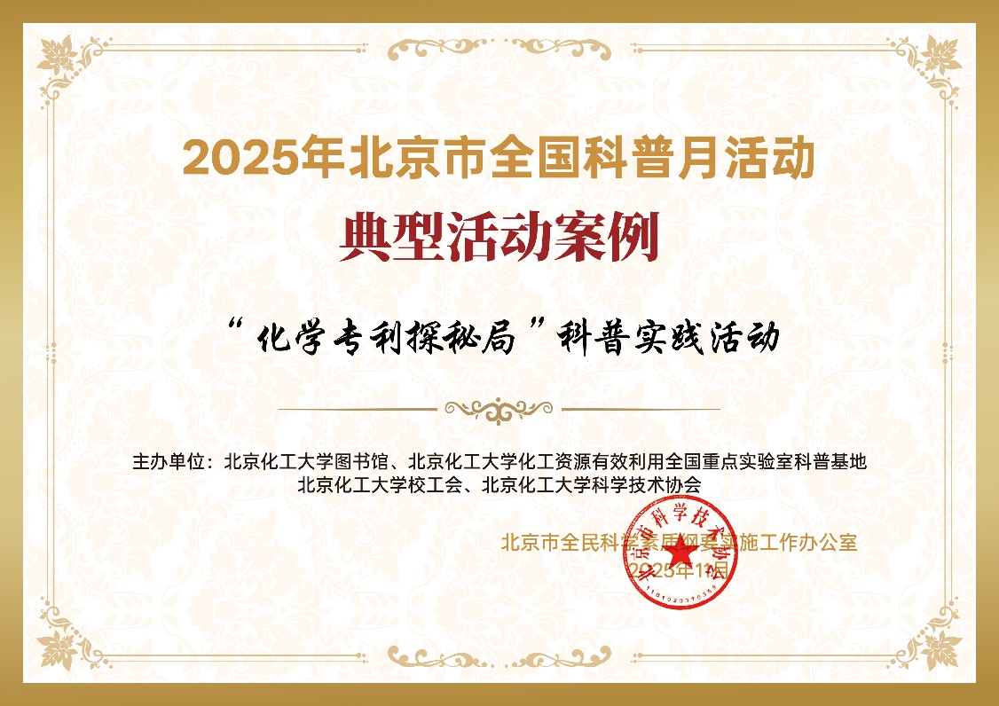 2025年全国科普月期间,校图书馆与校科协、全国科普教育基地等单位联动策划“化学专利探秘局”主题活动,以互动体验形式吸引150余名青少年参与,获评“北京市全国科普月典型活动案例。