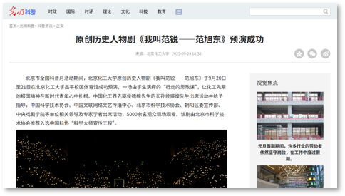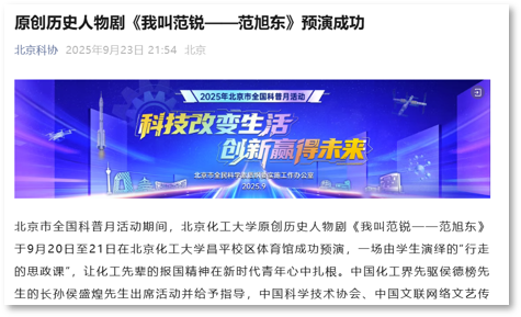 校团委联合校科协支持原创话剧《我叫范锐——范旭东》创排公演,累计吸引5000余名师生观看,获光明网、中国文艺网等媒体报道,实现科学精神与思政教育的艺术融合。