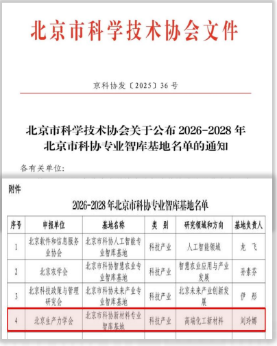 “北京市科协新材料专业智库基地”成功获批北京市科学技术协会2026-2028年度专业智库基地,该基地由北京生产力学会组织申报、北京化工大学作为核心支撑单位,我校文法学院刘玲娜副教授担任负责人,汇聚多所高校及行业专家。基地聚焦高端化工新材料五大方向,开展前瞻性战略研究与决策咨询,致力于构建产业创新服务体系,服务首都“高精尖”产业发展需求。此次获批标志着我校在服务首都发展战略、强化智库建设方面取得重要突破,也为我校拓展交叉学科研究、提升社会服务能力注入新动力。