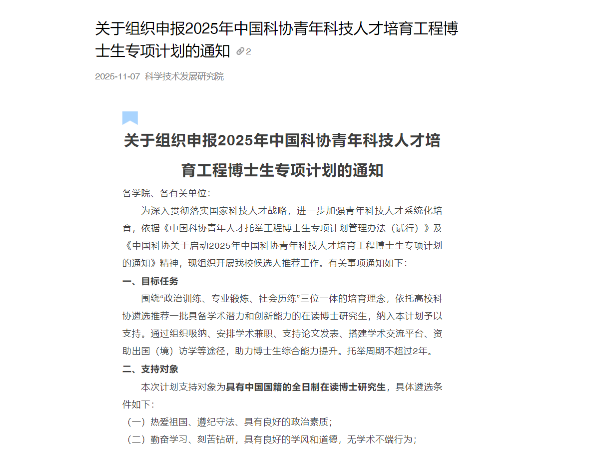 15名博士生成功入选中国科协青年科技人才培育工程博士生专项,该计划是国家强化战略人才后备力量建设的重要项目,通过导师指导、资源支持和国际交流,助力优秀博士生在关键科技领域实现突破。